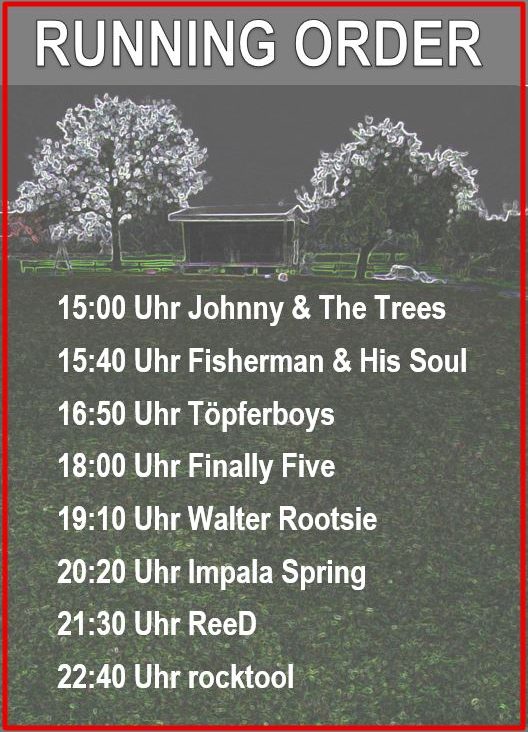 Wir versuchen, die Zeiten möglich genau einzuhalten. Jede Band wird ein 45-50 Minuten Set spielen. Zwischen den Bands gibt es eine Umbauzeit von ca. 20 Minuten, in der Ihr Zeit habt, Euch um das leibliche Wohl zu kümmern.